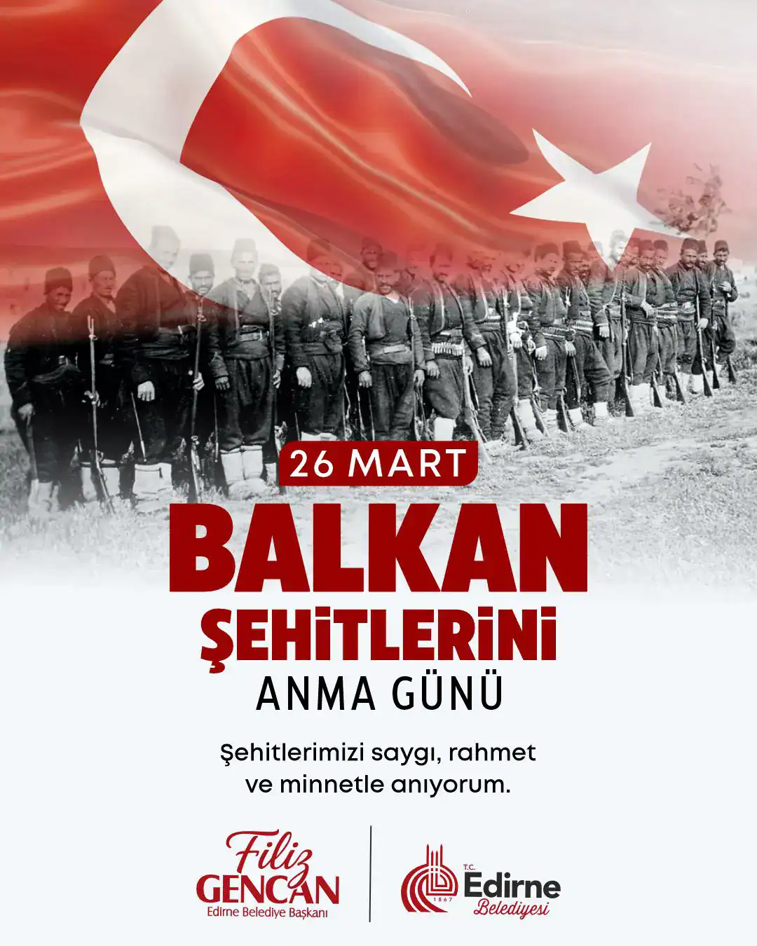 Edirne Belediye Başkanı Filiz Gencan, 26 Mart Balkan Şehitlerini Anma Günü dolayısıyla bir mesaj yayımladı. Gencan, Edirne Müdafii Şükrü Paşa ve kahraman askerlerin gösterdiği efsanevi direnişin, Türk tarihinin en gurur verici sayfalarından biri olduğunu vurguladı.